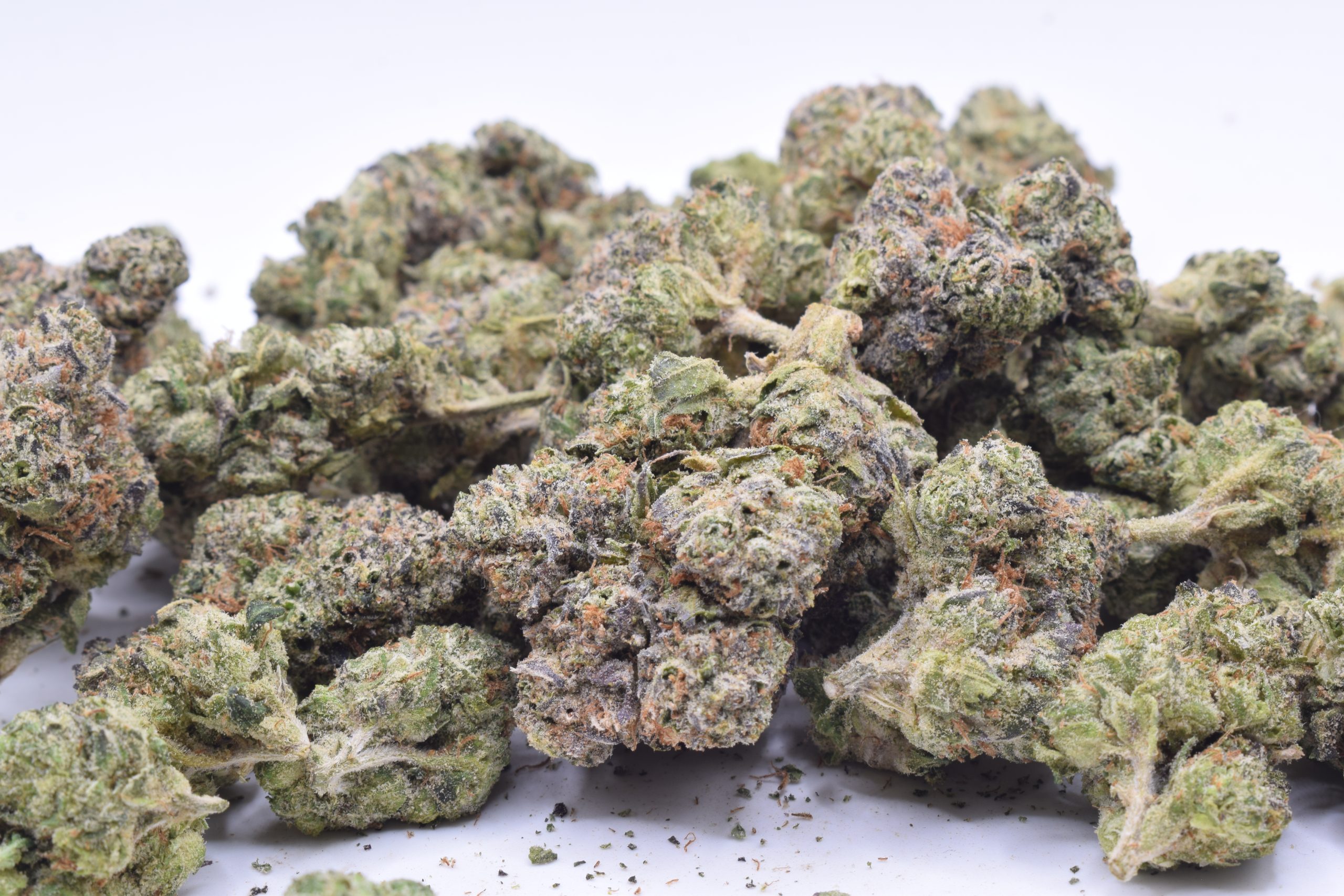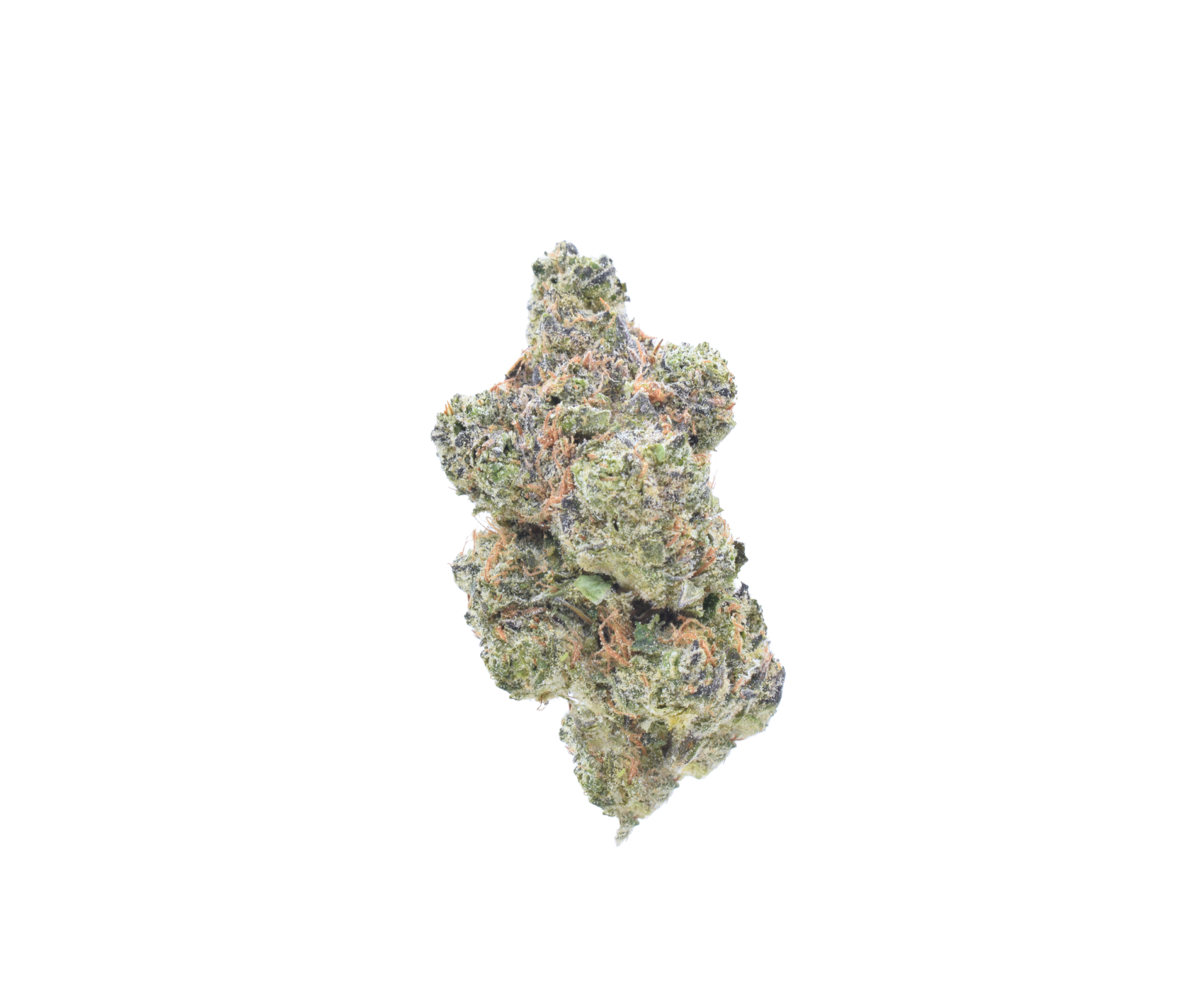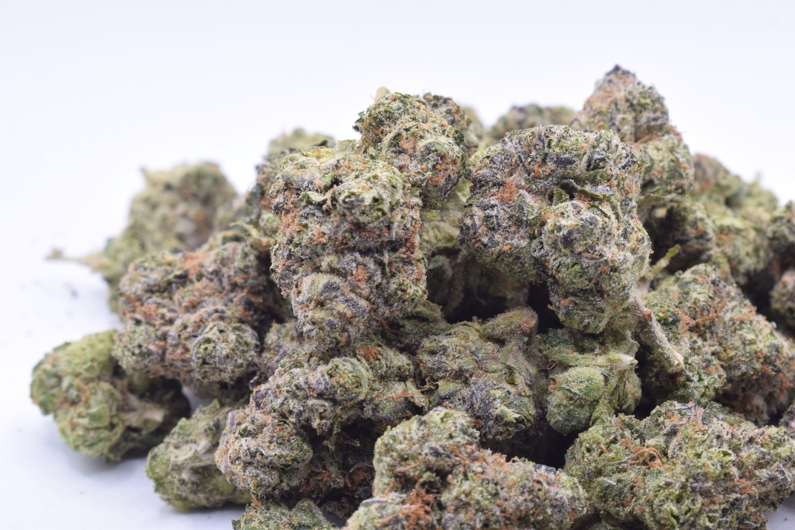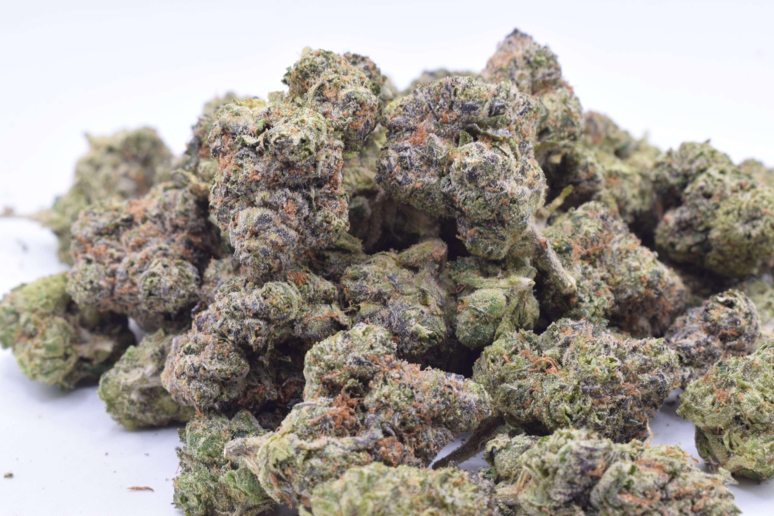 Appearance: Dense buds with dark purple hues, vibrant orange hairs, and a thick, frosty layer of trichomes.
